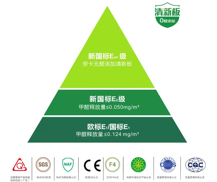 此次全新ENF级标准,比此前CARB-NAF标准的甲醛规定值还低了一半,打破了国际标准高于国内标准的惯例,成为目前全球最严苛环保标准,位于环保等级金字塔尖。
